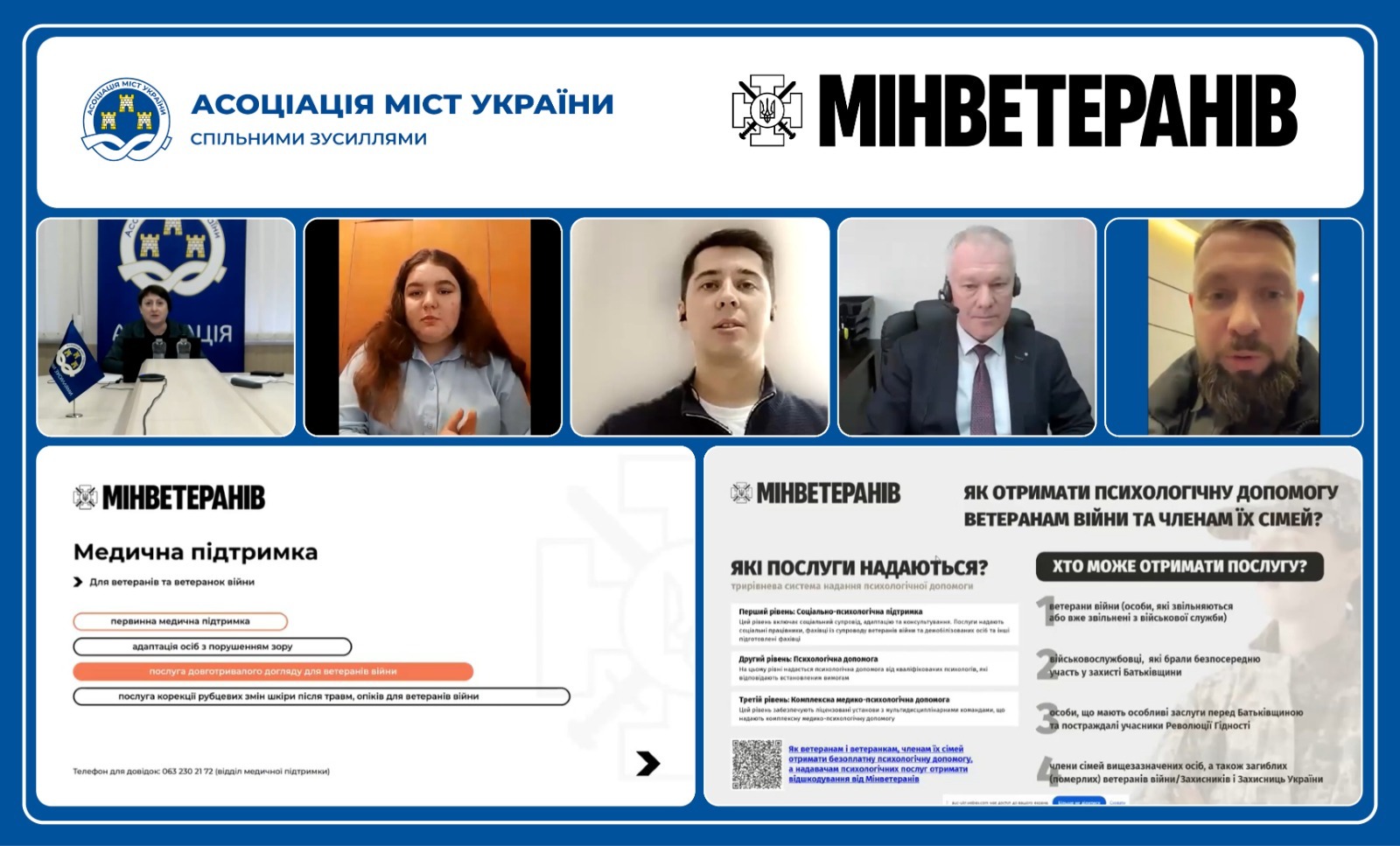 У межах засідання фахової мережі з питань соціального захисту та соціального забезпечення відбулися відкриті діалоги, під час яких представники громад – членів Асоціації міст України отримали відповіді на питання, що виникають при наданні медичних, психологічних і інших послуг ветеранам, ветеранкам та їх сім’ям.