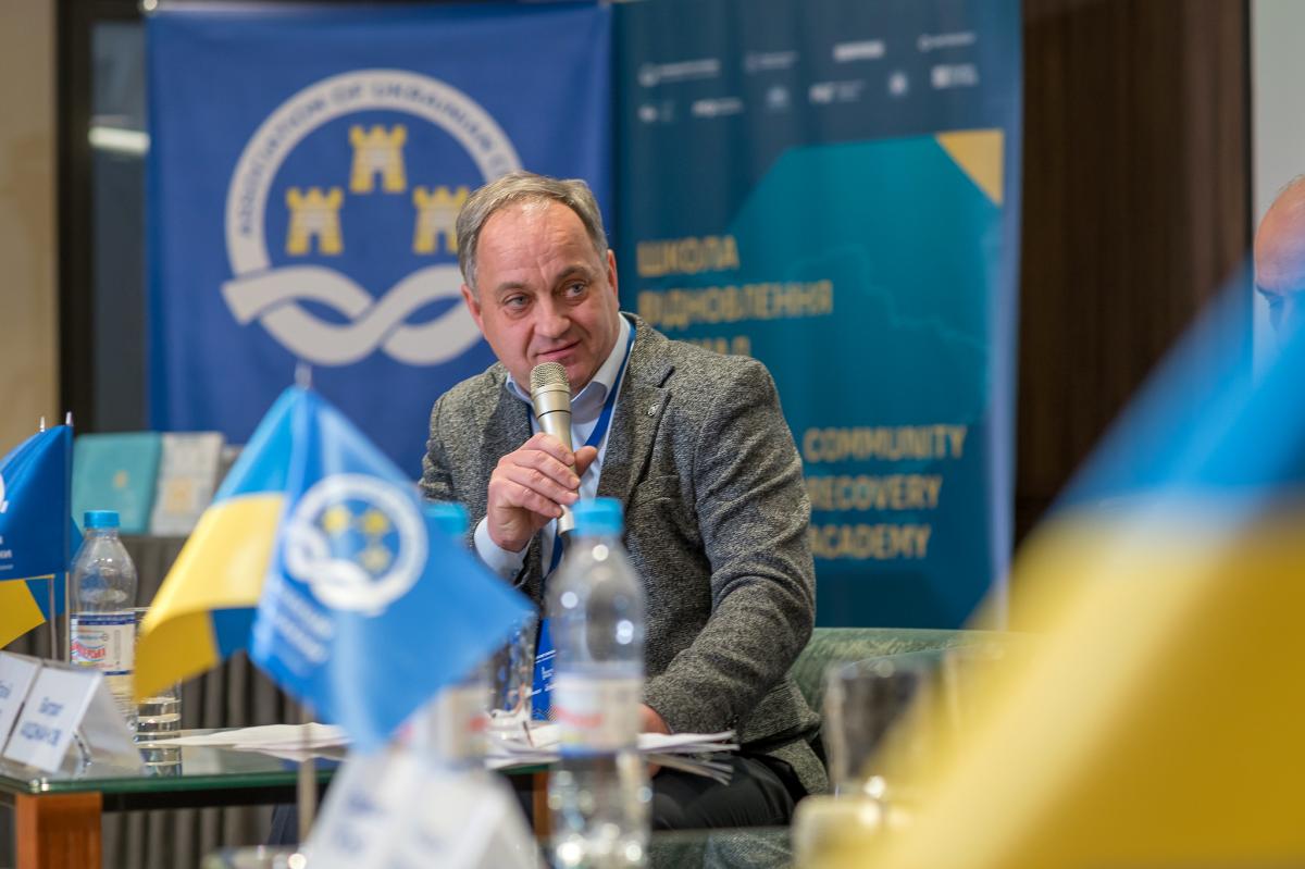 Вадим Бойченко проінформував про результати навчання команд першого набору Школи відновлення громад Асоціації міст України, зазначив про можливості продовження навчання учасників у вищих навчальних закладах, представив новий модуль другого набору й підкреслив, що можливості громад, які надаються Школою відновлення, збільшуються.