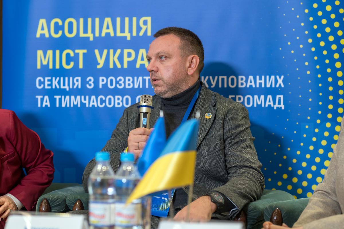 Максим Ткаченко закцентував увагу на тому, що діяльність Секції Асоціації міст України з розвитку деокупованих та тимчасово окупованих громад стосується не територій, а насамперед людей, розповів про діяльність Парламенту із забезпечення житлом внутрішньо переміщених осіб.