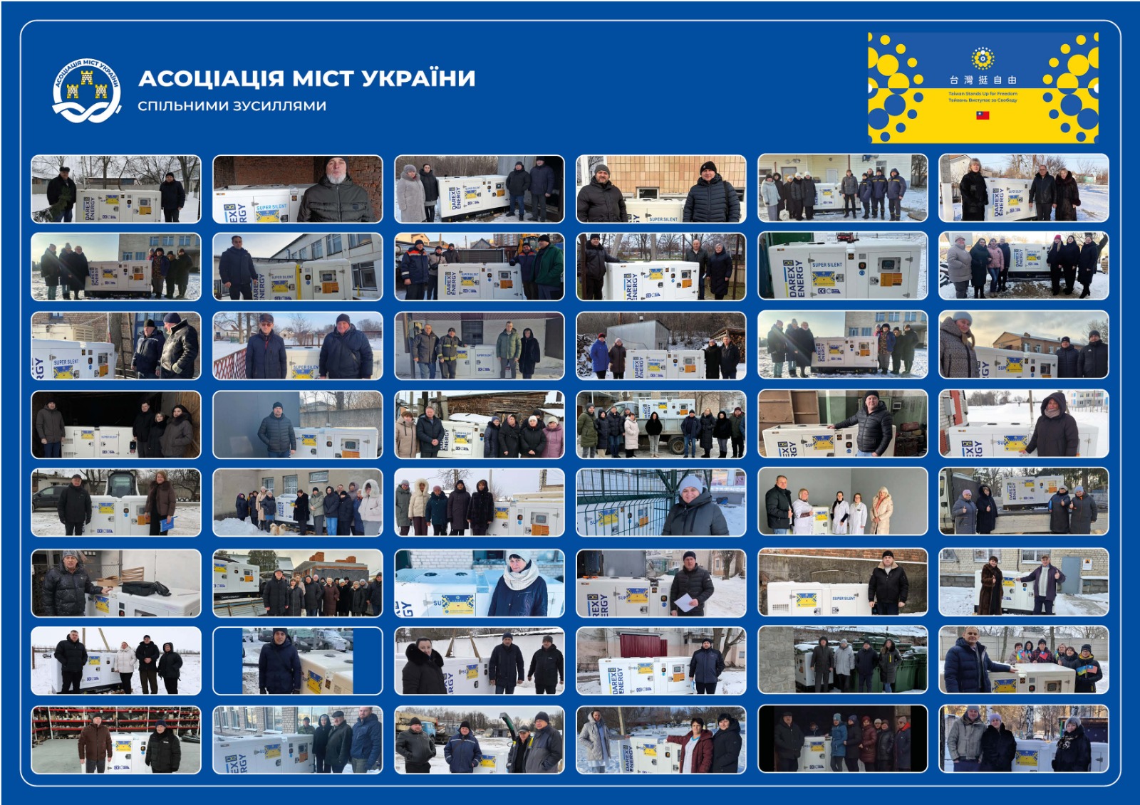 154 потужні генератори, кожен з яких вже сьогодні забезпечує цілі школи чи садочки, отримали громади України в межах Меморандуму про взаєморозуміння та співпрацю Асоціації міст України з Представництвом Тайбею.