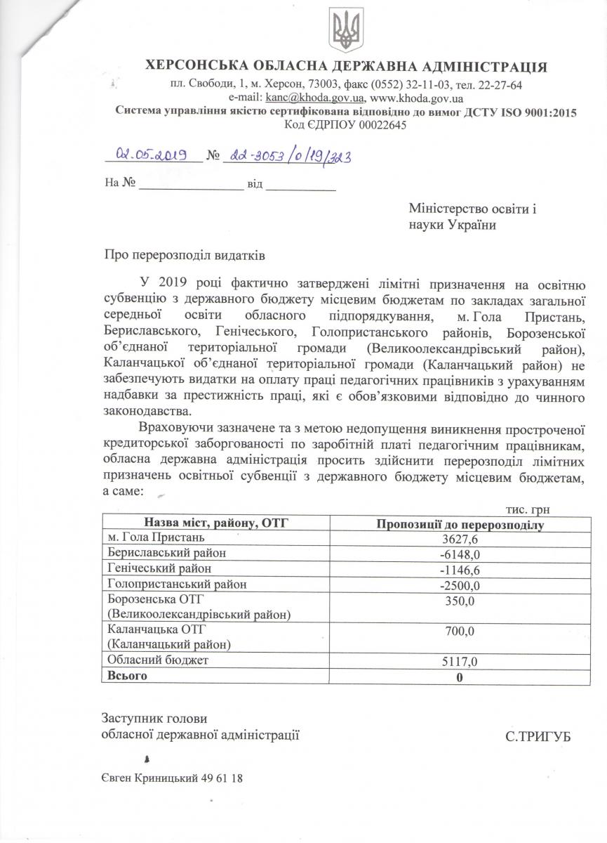 Звертаємо увагу, наприклад, що станом на 3 липня 2019 року досі не розглянуто МОН подання Херсонської обласної державної адміністрації від 02.05.2019 року № 22-3053/0/19/323 «Про перерозподіл видатків» (додається), що призводить до виникнення критичної ситуації з виплатами заробітних плат та інших визначених законодавством України виплат у містах та ОТГ. Зокрема, для м. Гола Пристань не профінансовано 3627,6 тис гривень, що викликає соціальну напругу у громаді. Подібна ситуація з дефіцитом коштів склалась у м. Чорткові Тернопільської області (лист до АМУ від 18.06.2019 року № 2/01-15/764), педагоги якого очікували на наближення коштів освітньої субвенції на червень 2019 року в обсязі 1310 тис гривень (загальний дефіцит коштів у м. Чорткові складає у 2019 році 5167,1 тис грн).