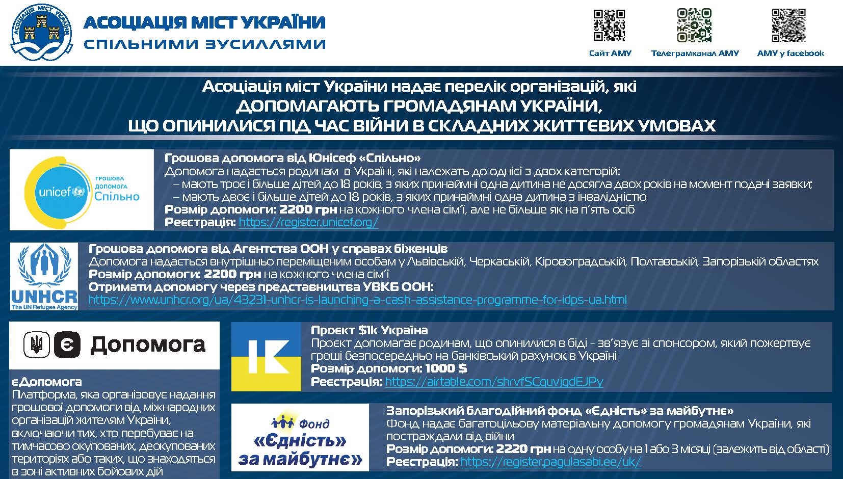 Асоціація міст України презентує довідник "Перелік організацій, які допомагають громадянам України, що опинилися під час війни в складних життєвих умовах". Добірка містить описання допомоги, що надається організацією або фондом, а також лінки і контакти, за якими можна зареєструватися для отримання допомоги.