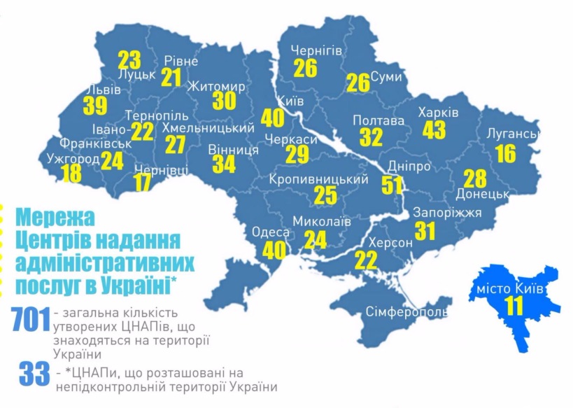 Мережа Центрів надання адміністративних послуг (ЦНАПів) розвивається в Україні з 2008 року. Сьогодні працює 701 ЦНАП, з яких 11 у Києві.