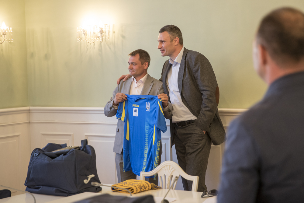 Голова Асоціації міст України, Київський міський голова Віталій Кличко зустрівся зі збірною футбольною командою мерів українських міст, які 19 травня проведуть товариський матч з колегами із Польщі, та передав їм комплекти спортивної форми.