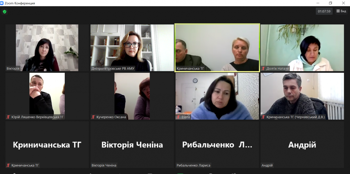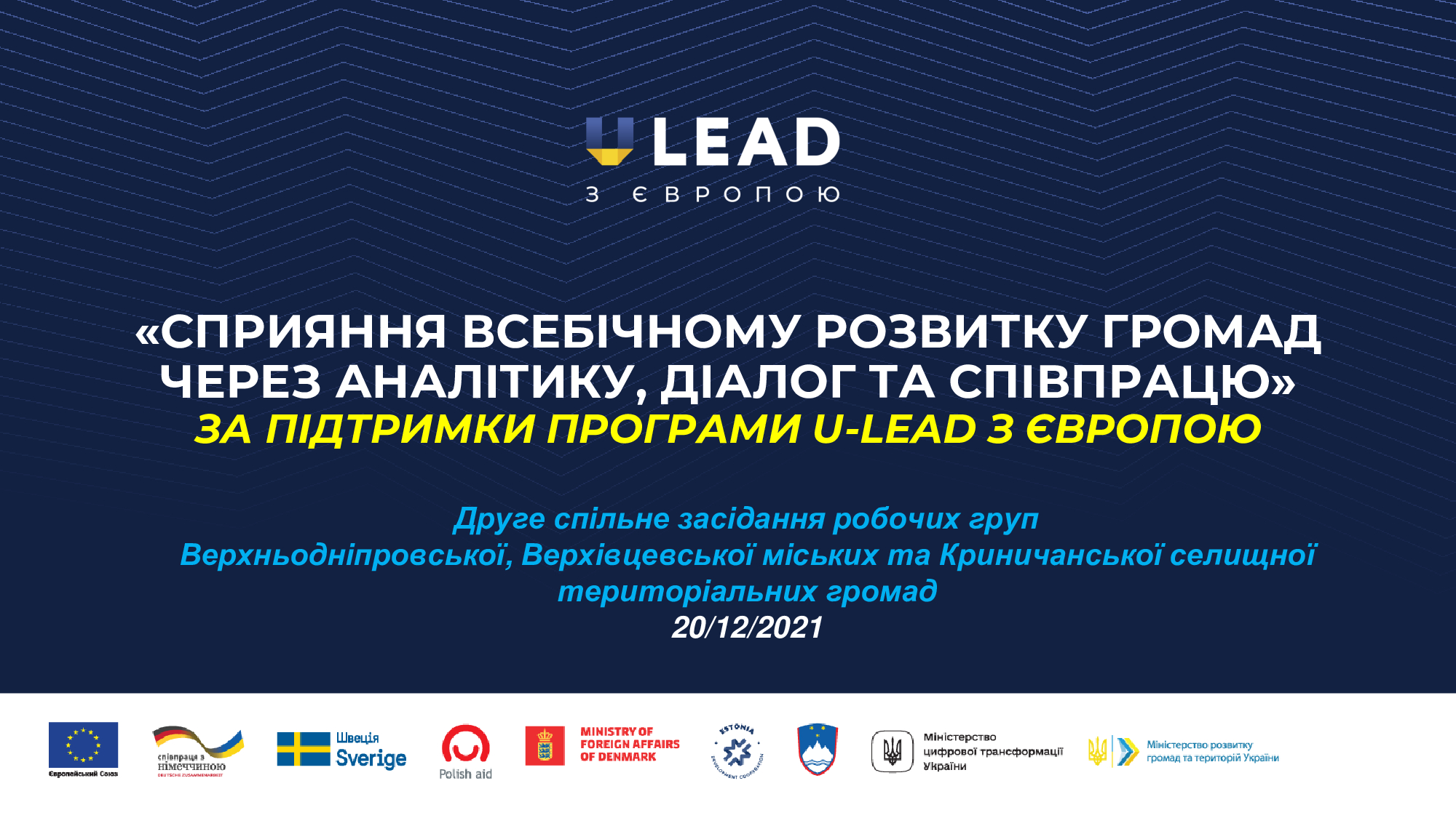 20 грудня в онлайн режимі відбулося друге спільне засідання Робочих груп із налагодження співробітництва Верхньодніпровської, Верхівцевської міських та Криничанської селищної територіальних громад Дніпропетровської області в рамках реалізації проєкту «Сприяння всебічному розвитку громад через аналітику, діалог та співпрацю» за підтримки Програми «U-LEAD з Європою», що реалізується відповідно до грантової угоди між Всеукраїнською асоціацією органів місцевого самоврядування «Асоціація міст України» та Німецьким товариством Міжнародного співробітництва (GIZ).