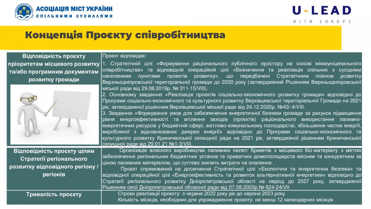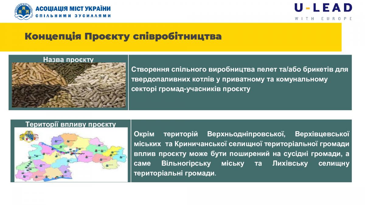 Експертка проєкту Олена Воронько презентувала підготовлену концепцію співробітництва з урахуванням пропозицій представників громад та технічних вихідних даних щодо можливостей кожної громади розмістити виробничі потужності та забезпечити сировиною виробництво пелет.