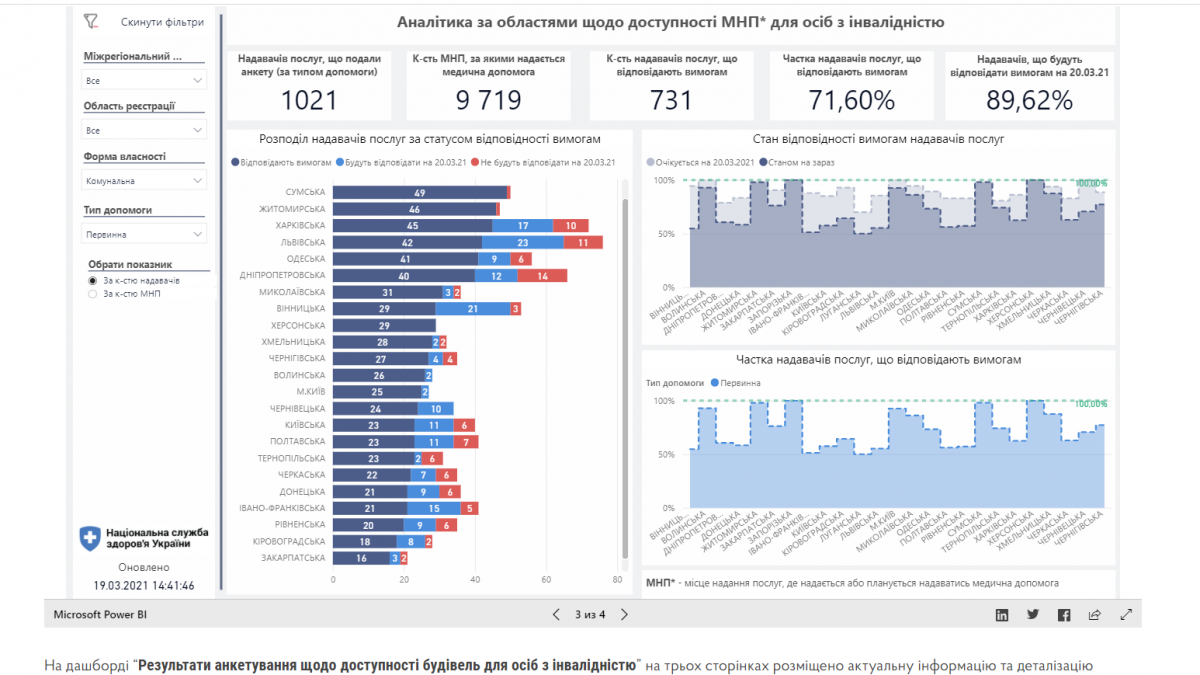 Аналітик АМУ з питань охорони здоров’я Світлана Осташко в інтервю газеті "Ваше здоров’я" зазначила, що результати аналізу даних дашбордів НСЗУ свідчать про те, що станом на початок березня 2021 року частка медичних закладів, що відповідають вимогам доступності, з числа усіх медичних закладів, складає лише 71,6%. З числа медичних закладів, які надають первинну медичну допомогу, таким вимогам відповідають лише 62,9%. З числа ж медичних закладів, що надають спеціалізовану медичну допомогу на сьогодні відповідають вимогам доступності 80%.