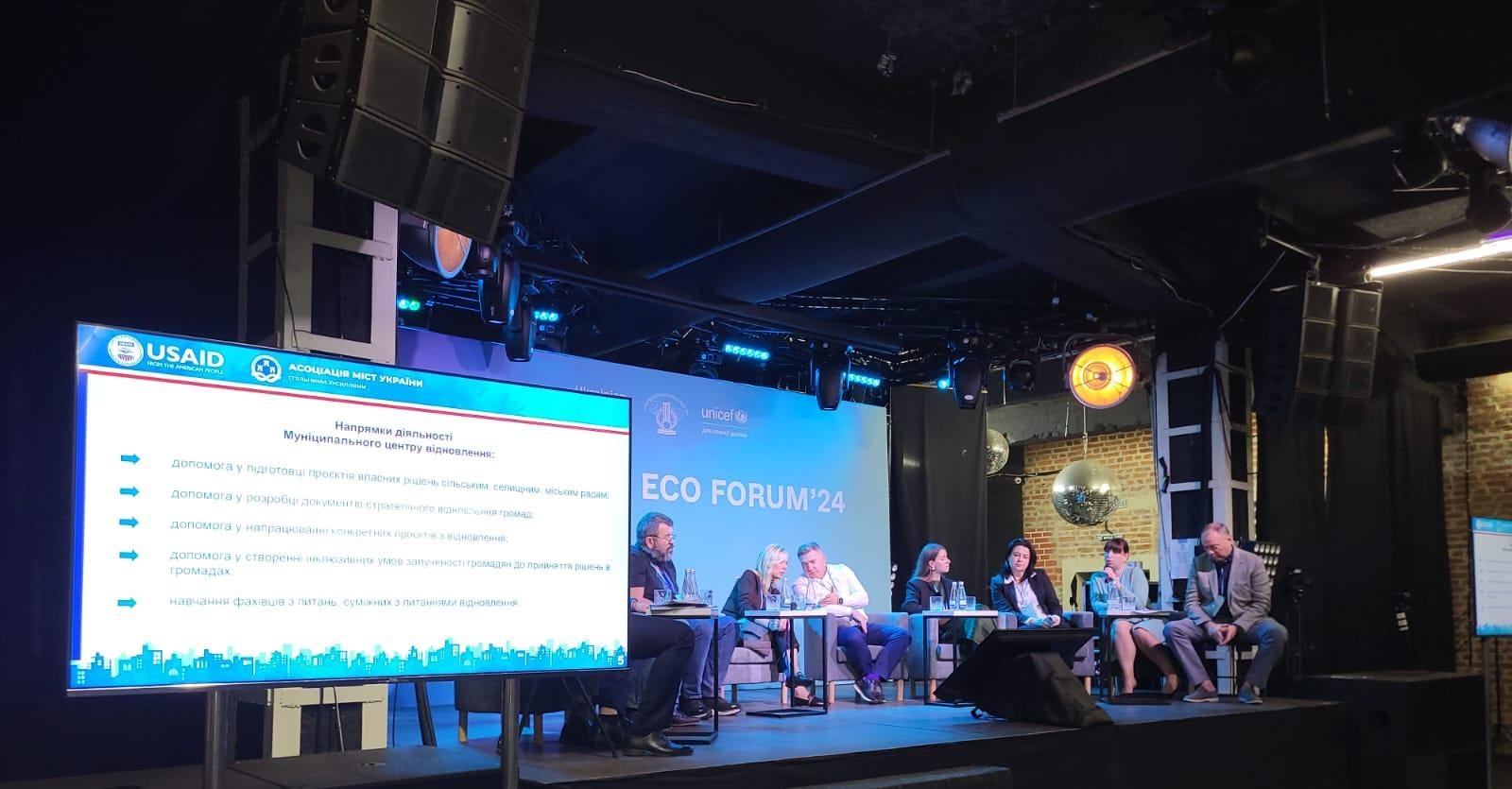 Оксана Бондарець, директорка проєкту «Забезпечення функціонування Муніципального центру відновлення, Асоціації міст України», під час другої панельної дискусії LVIV ECO FOROM'24 Муніципальний центр відновлення, створений Асоціацією міст України за підтримки проєкту USAID «Підвищення ефективності роботи і підзвітності органів місцевого самоврядування «ГОВЕРЛА». Вона наголосила, що Асоціація міст України з 1992 року представляє позицію та захищає інтереси місцевого самоврядування на державному рівні, а сьогодні робота ведеться на трьох рівнях.