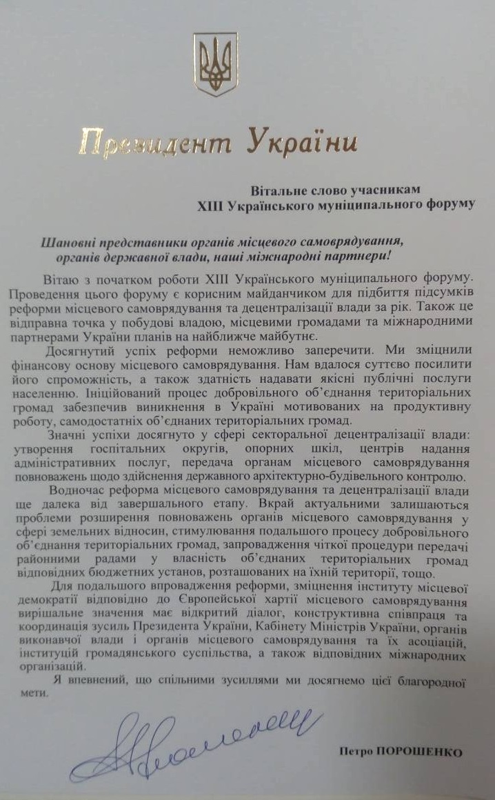 Поділитися: 18 / Вересень, 2017В Одесі триває ХІІІ Український муніципальний форум. Вітальне слово учасникам Форуму надіслав Президент України Петро Порошенко.