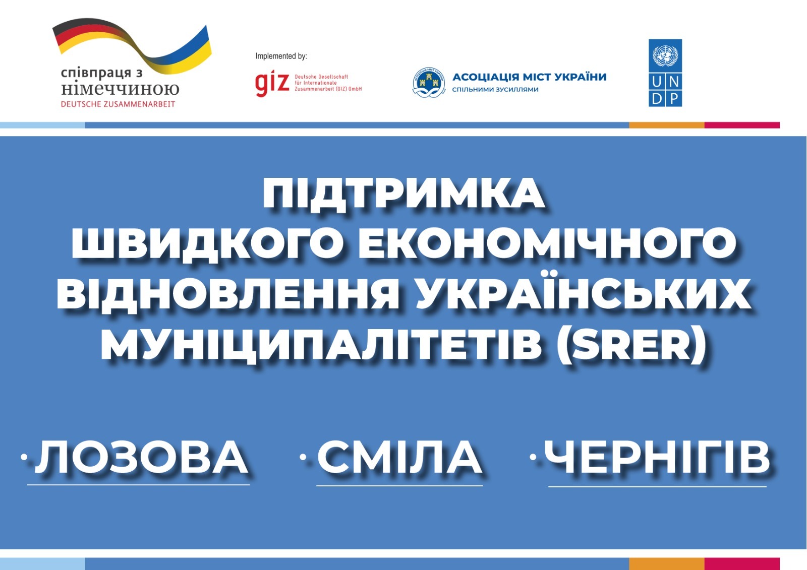 Проєкт «Підтримка швидкого економічного відновлення українських муніципалітетів» (SRER) реалізується Програмою розвитку ООН (ПРООН) в Україні за підтримки проєкту міжнародної співпраці ReACT4UA («Застосування та імплементація Угоди про асоціацію між ЄС та Україною у сфері торгівлі»), який фінансується урядом Німеччини та реалізується німецькою федеральною компанією Deutsche Gesellschaft fürInternationale Zusammenarbeit (GIZ) GmbH.