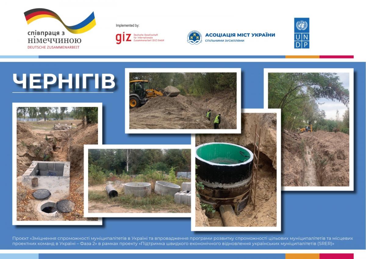 За фінансування Уряду Німеччини у Чернігові реконструйовано понад 2 кілометри водопроводу, пошкодженого російськими обстрілами під час місячної блокади у 2022 році Чернігова, встановлено нові колодязі та камери для підключення промислових об’єктів із заміною старої запірної арматури на сучасну.