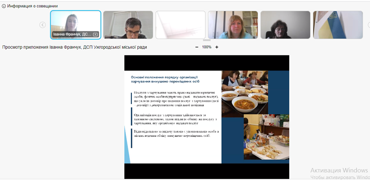 Під час Діалогового заходу було обговорено актуальні методи організації соціального захисту та соціального забезпечення внутрішньо переміщених осіб, зокрема, про практику організації харчування внутрішньо переміщених осіб в Ужгородській міській територіальній громаді розповіла Заступник директора Департаменту соціальної політики Ужгородської міської ради Іванна Подоляк (презентація).