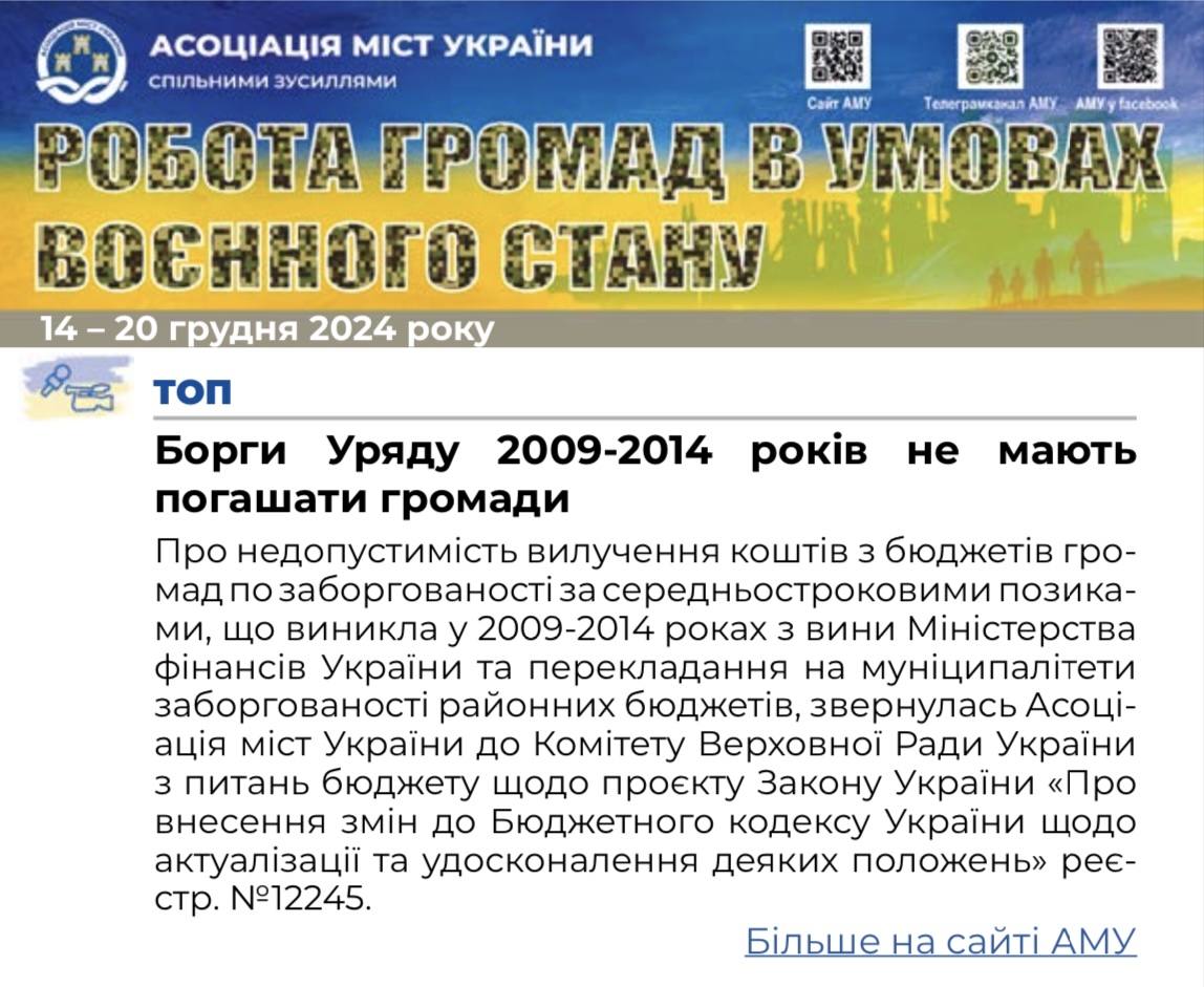 Поділитися: 21 / Грудень, 2024Щотижневий дайджест Асоціації міст України,випуск за 14 - 20 грудня 2024 року.