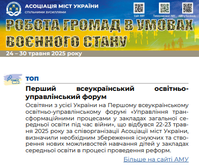 Поділитися: 31 / Травень, 2025Щотижневий дайджест Асоціації міст України,випуск за 24 – 30 травня 2025 року