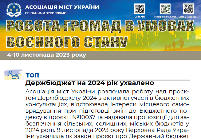 Поділитися: 11 / Листопад, 2023Щотижневий дайджест Асоціації міст України, випуск за 4-10 листопада 2023 року. Галузь: Об’єднання громад