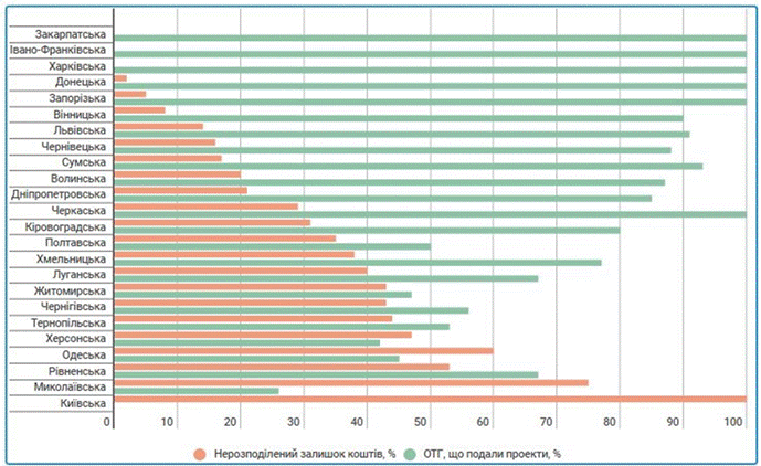За даними Мінрегіону, більше половини коштів субвенції усе ще не розподілили ОТГ Миколаївської (залишок 75%), Одеської (залишок 60%) та Рівненської (залишок 53%) областей.