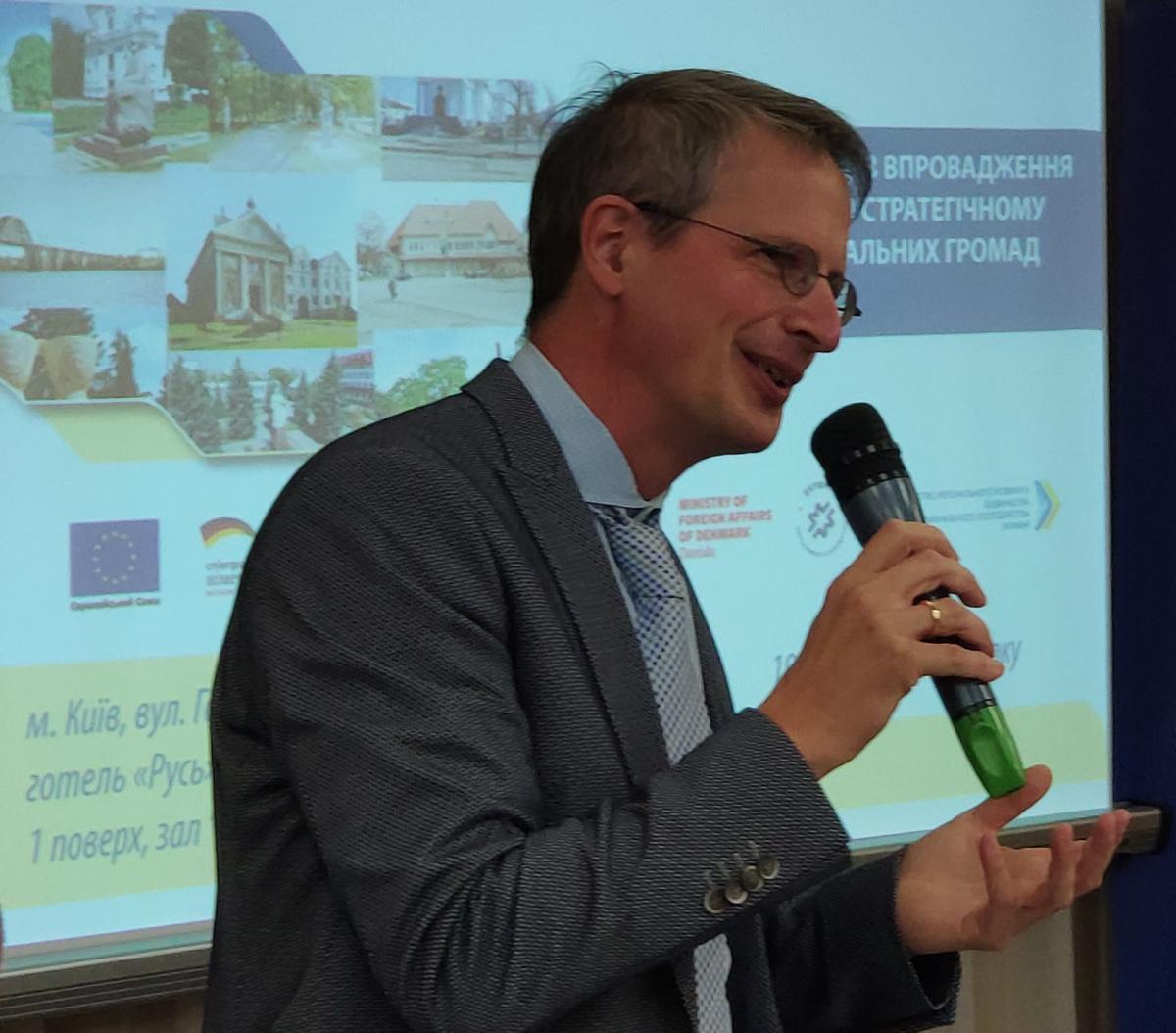 Директор Програми «U-Lead з Європою» від GIZ Б.Файгель привітав усіх та зазначив: «Ми раді, що можемо підтримувати вас у розробці і написанні цих детальних стратегій, які будуть дуже важливими для вас у майбутньому. Стратегія має вас надихати і допомагати приймати важливі для вашої громади рішення. Основне завдання документу не в тому, щоб знайти кошти чи гранти на втілення тих чи інших заходів, а можливість показати шлях, по якому ваша громада рухатиметься до благополуччя. Ми раді, що можемо підтримувати процес децентралізації разом з Асоціацією міст України, оскільки ці зусилля мають бути спільними та посилюватися на національному рівні».