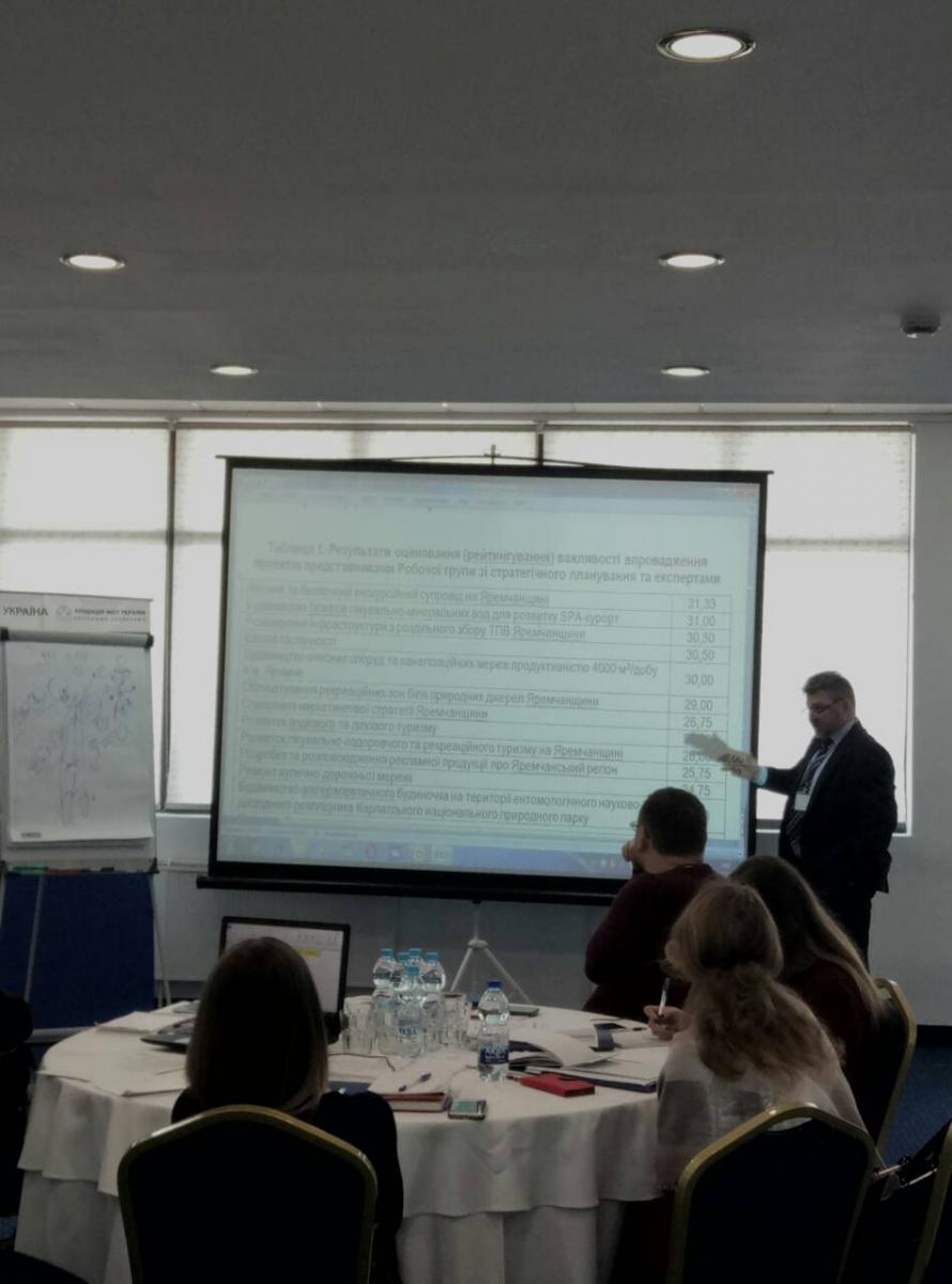 Тренери Ігор Воляник та Олександр Волошинський проводять для навчальної групи практикум з відбору технічних завдань на проекти розвитку до плану реалізації стратегії територіальної громади. В ході заходу учасники дізнаються, як відбирати, аналізувати та пріоретизувати подані ідеї проектів для реалізації в рамках стратегії розвитку громади.