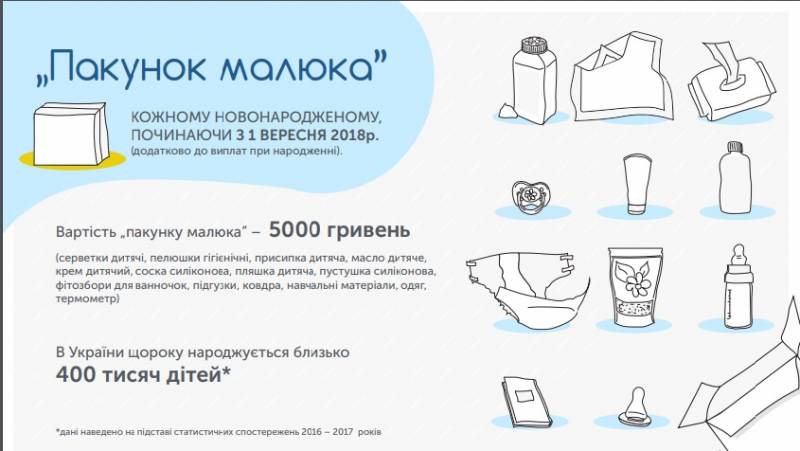 ПАКУНОК МАЛЮКАЗапровадження натуральної допомоги «пакунок малюка» планується з 1 вересня цього року. До «пакунку малюка» буде входити: серветки дитячі, пелюшки гігієнічні, присипка дитяча, масло дитяче, крем дитячий, пляшка дитяча, соска силіконова, пустушка силіконова, фітозбори для ванночок, підгузки сумарною вартістю 5000 гривень.