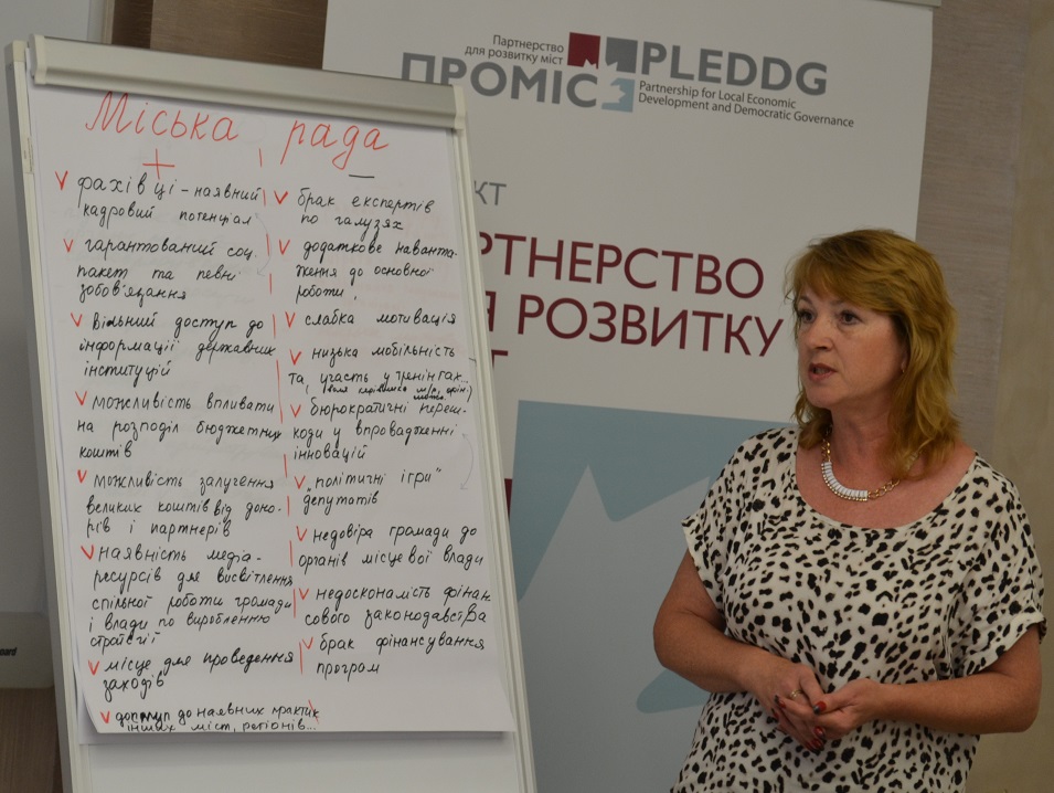 Тренерка семінару Дяченко Аліна («Інститут розвитку міст», м. Вінниця) розповіла про восьмирічний досвід роботи підприємства, його завдання, проекти, роботу над розробкою стратегії розвитку «Вінниця-2020» та поточну роботу над стратегією інтегрованого розвитку міста «Вінниця-2030». Також вона розповіла про проект створення системи муніципального велопрокату як аналогу швейцарських проектів аналогового міського екологічного транспорту. Загальна вартість проекту 312 тисяч євро, термін реалізації – до 2019 року. Проект реалізується спільно зі швейцарцями, окрім того, Вінниця співпрацює з ними ще по декількох напрямках – енергоефективність та екологічність міського середовища.