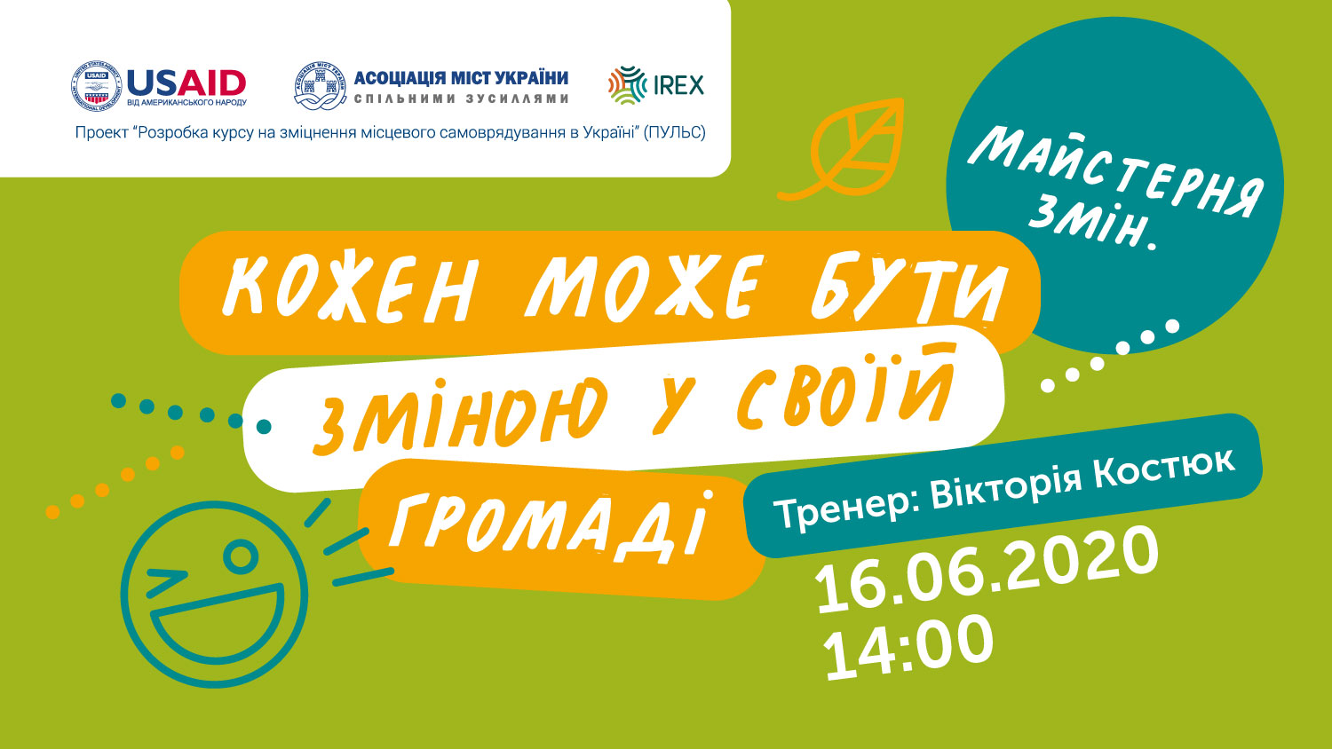 Наступний вебінар відбудеться 16 червня 2020 року о 14 годині. Тема - «Майстерня змін: кожен може бути зміною у своїй громаді». Під час заходу учасники обговорять практики участі молоді у прийнятті рішень на місцевому рівні: що для цього потрібно і як мотивувати молодь до діяльності. Також будуть представлені історії успіхів молодих людей з різних громад. Крім того, на початку вебінару можна написати в чат «Маю історію + назва громади» і отримати можливість стати спікером онлайн-зустрічі та розповісти про такі успіхи.