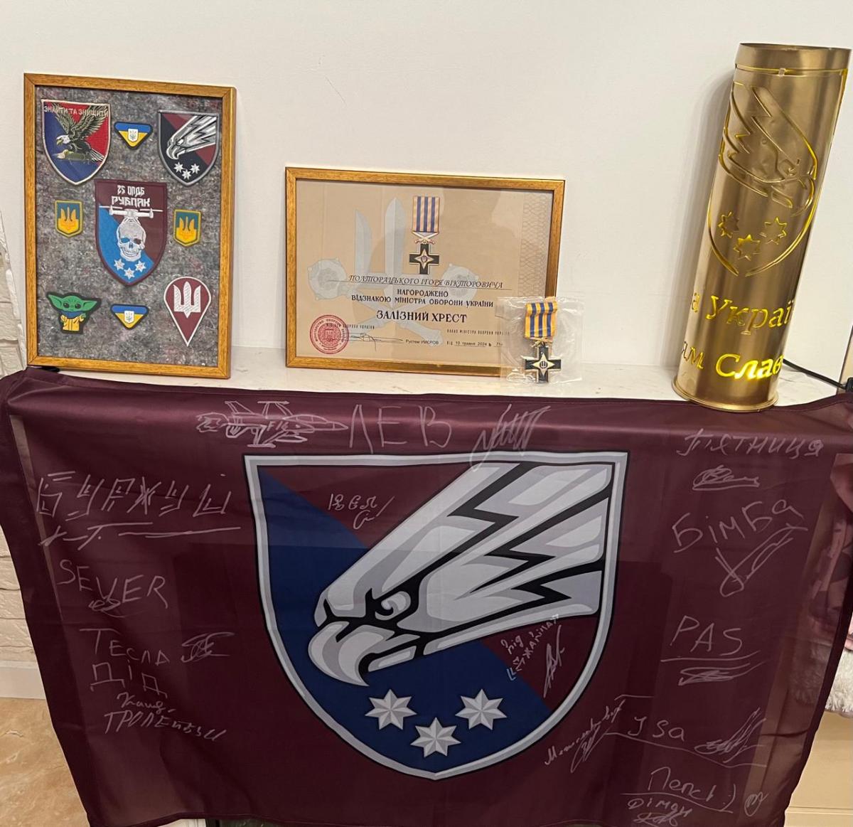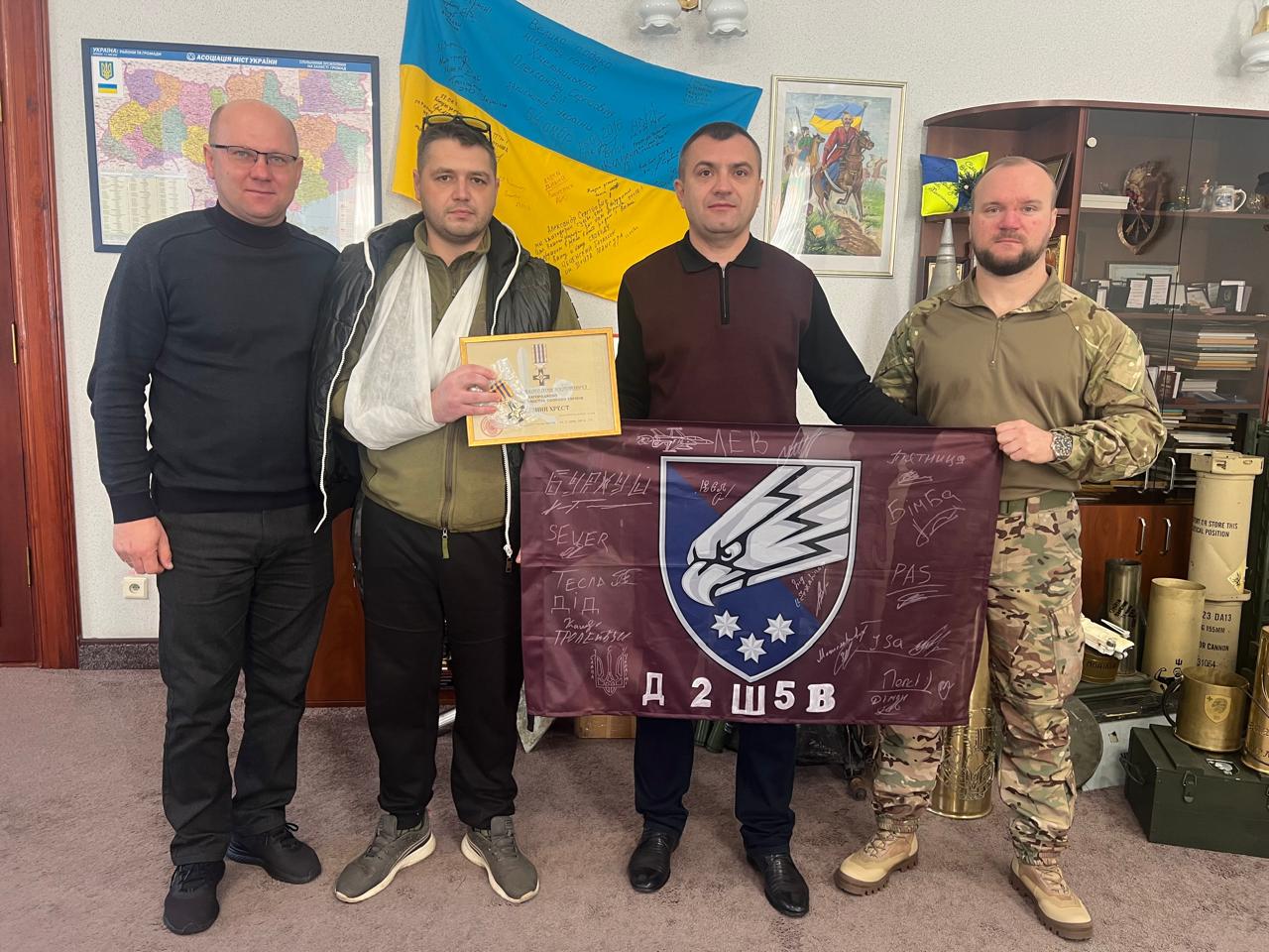 Володимир Арнаут від військової частини презентував Хмельницькому міському голові український прапор з підписами військовослужбовців, гільзу, бойові шеврони та подякував за систематичну допомогу Збройним Силам України.