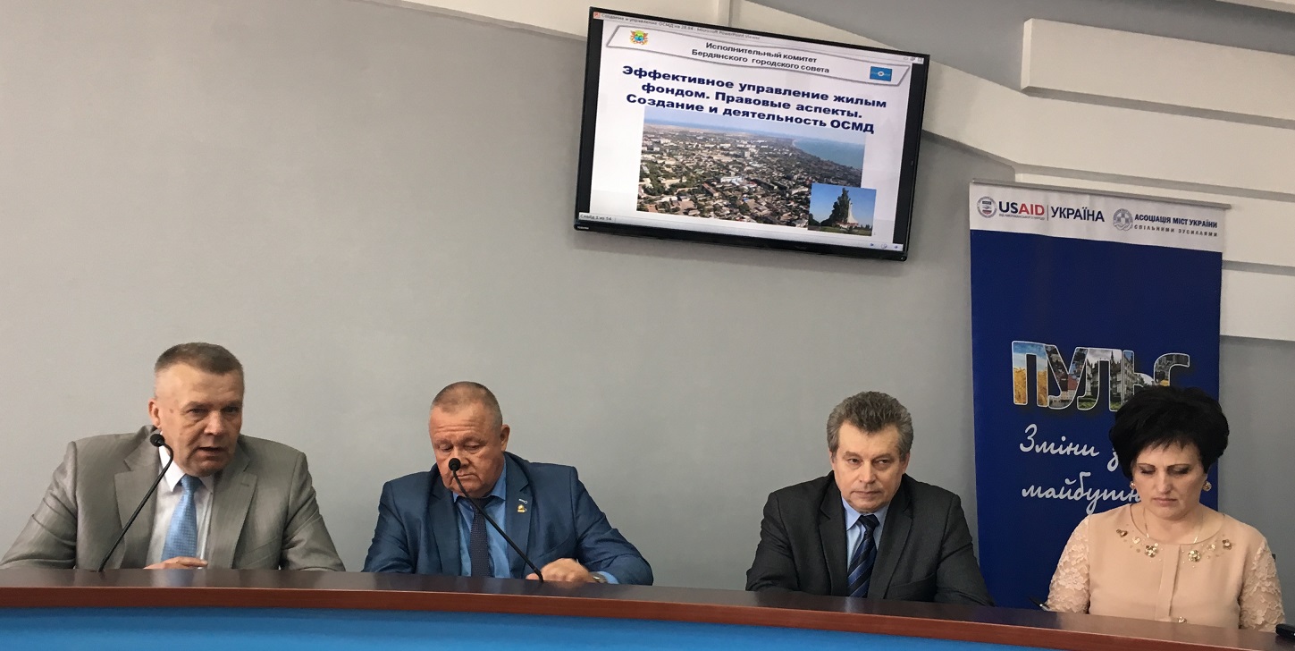 28 квітня в місті Бердянськ Запорізьке регіональне відділення Асоціації міст України провело практикум із застосування законодавства на тему: «Ефективне управління житловим фондом. Створення та діяльність ОСББ». Захід організовано в рамках Проекту «Розробка курсу на зміцнення місцевого самоврядування в Україні» (ПУЛЬС), який реалізує Асоціація міст України за підтримки USAID.