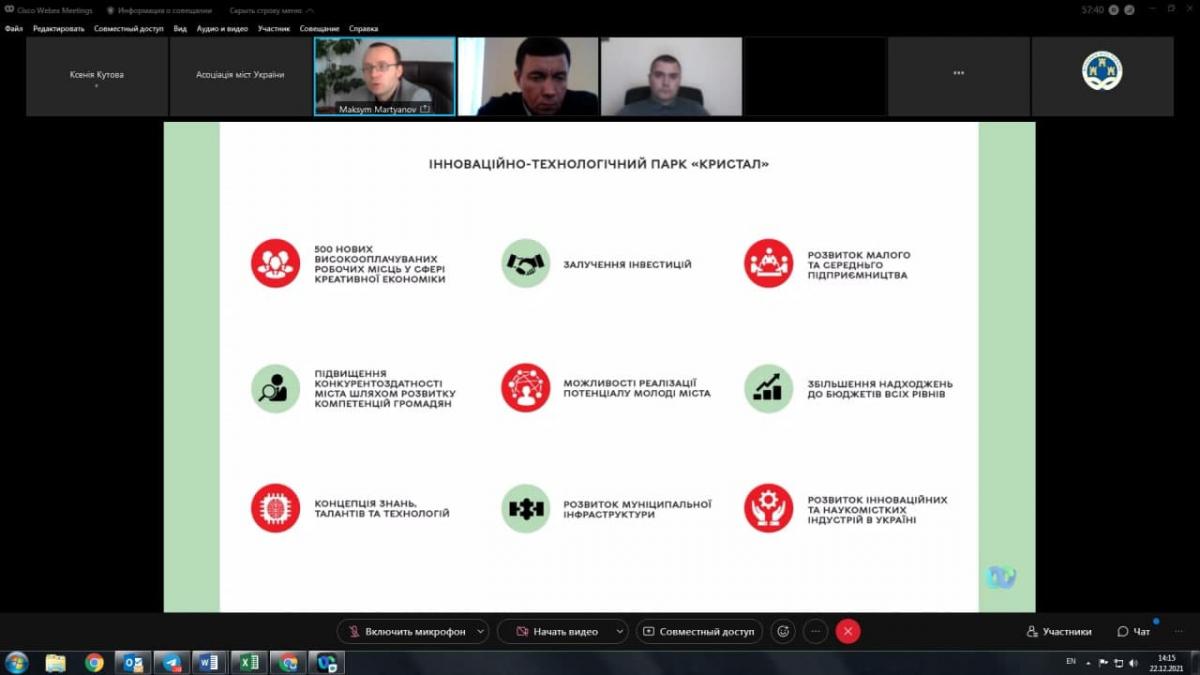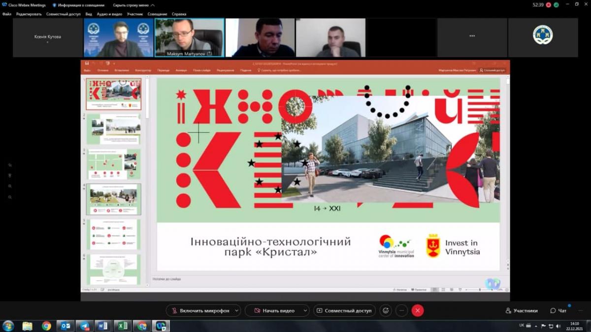 Обговорення актуальних питань функціонування ДФРР та реалізації територіальними громадами інфраструктурних проектів розпочав Максим Мартьянов, Директор Департаменту економіки і інвестицій Вінницької міської ради. Він виступив із презентацією «Технопарки як каталізатори місцевого економічного розвитку. Досвід створення Вінницького інноваційно-технологічного парку «Кристал»».