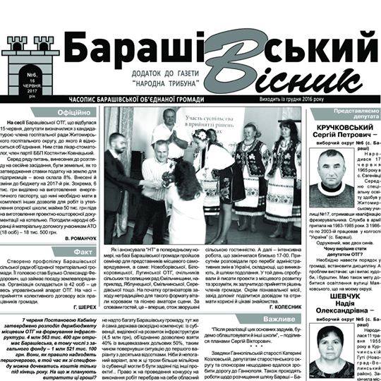 Газета Ємільчинського району «Народна трибуна» раз на місяць виходить із додатком – часописом Барашівської ОТГ «Барашівський вісник». На його сторінках публікуються важливі рішення ради об’єднаної громади, виступи посадовців, представлення депутатів та інші матеріали.